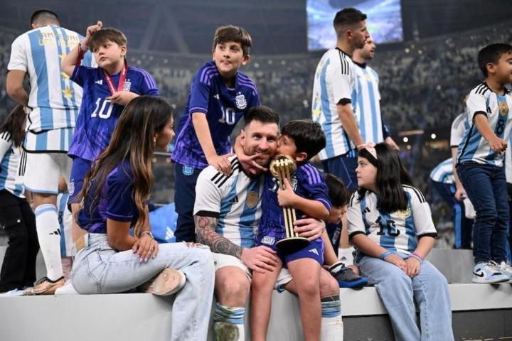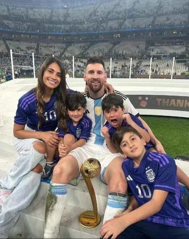 世界杯决赛后,梅西领阿根廷登上世界之巅。世界杯之旅落幕后,梅西由球王变回丈夫及父亲,和妻子安东内拉与3个儿子齐齐在球场共享天伦。当大儿子与二儿子在亲吻大力神杯的时候,小儿子西罗(2018年出生)只能亲吻爸爸,梅西脸上流露慈父的笑容。
