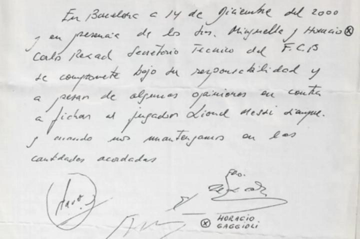 在其父亲千方百计的努力之下,梅西获得巴萨的试训机会。梅西罕见的天赋直接打动当时的一线队主管卡洛斯雷克萨奇。后者为了不让梅西这个绝世天才从自己身旁溜走,直接在酒店餐巾纸上草草与梅西签署协议。这就是之后被足坛津津乐道的梅西与巴萨第一份协议。