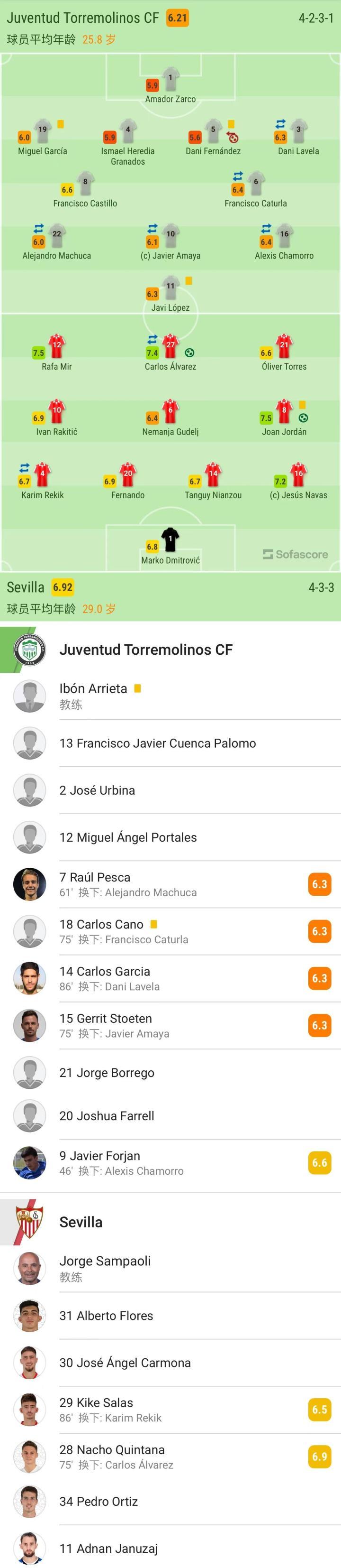 塞维利亚首发:1-德米特罗维奇、16-纳瓦斯、6-古德利、14-夸西、4-雷基克、8-霍尔丹、20-费尔南多、10-拉基蒂奇、27-卡洛斯-阿尔瓦雷斯、12-拉法-米尔、21-奥利弗-托雷斯、