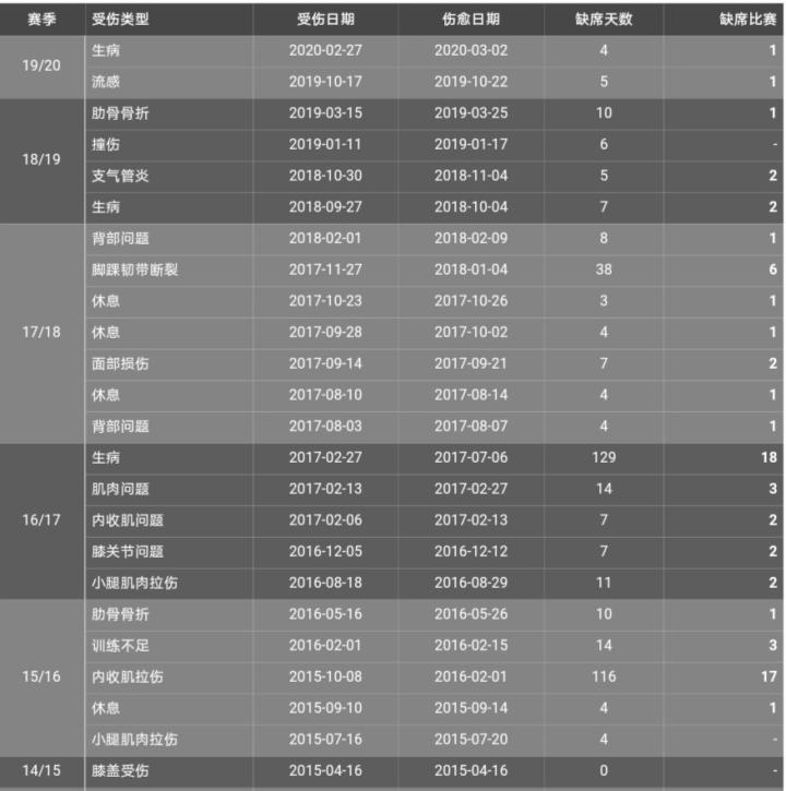 灵光一现之后的格策再次出现状况,场外因素导致格策状态不佳的原因之一。2015-16赛季由于内收肌拉伤缺席了116天,而2016-17赛季由于生病缺席了129天。从下图可以看出,格策因为生病、流感、支气管炎、休息等非场上因素而多次缺席。