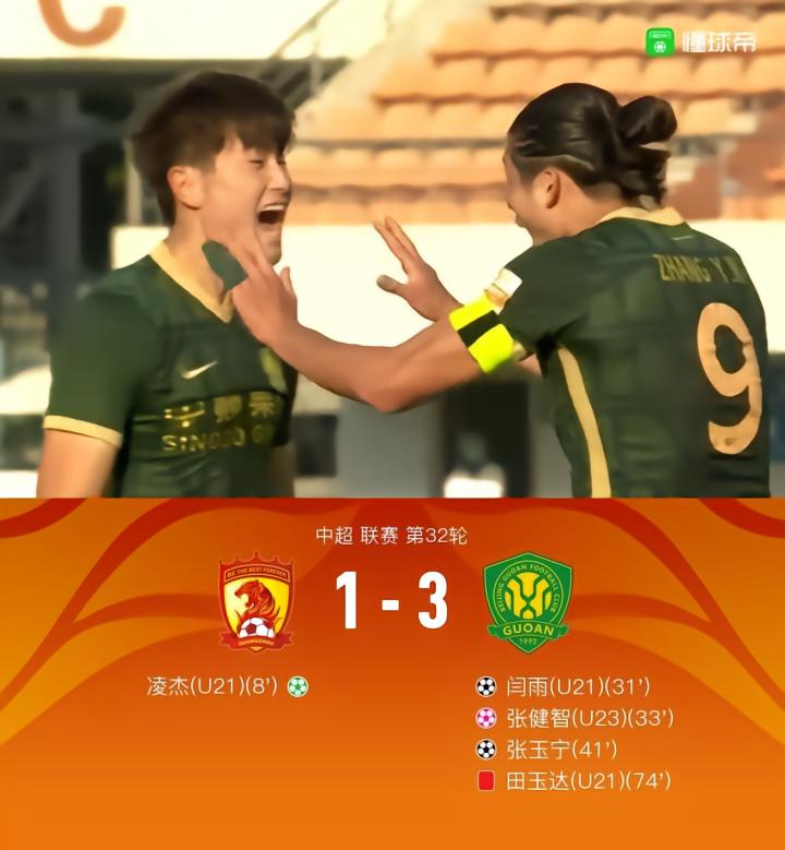【广州1-3国安保级形势堪忧,张玉宁、凌杰破门,田玉达直红】