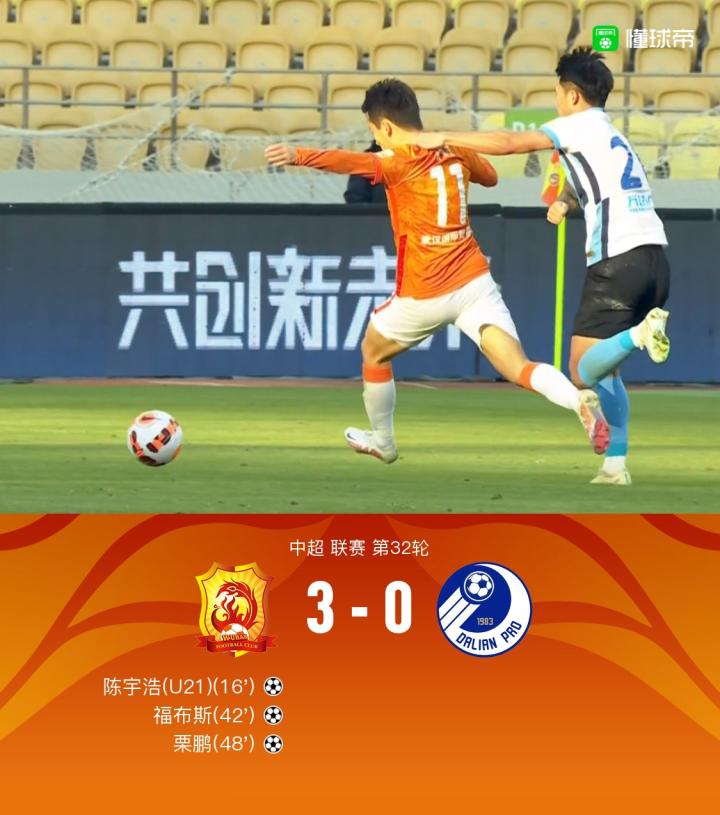 【武汉3-0大连收获宝贵3分,陈宇浩斩处子球,栗鹏、福布斯破门】