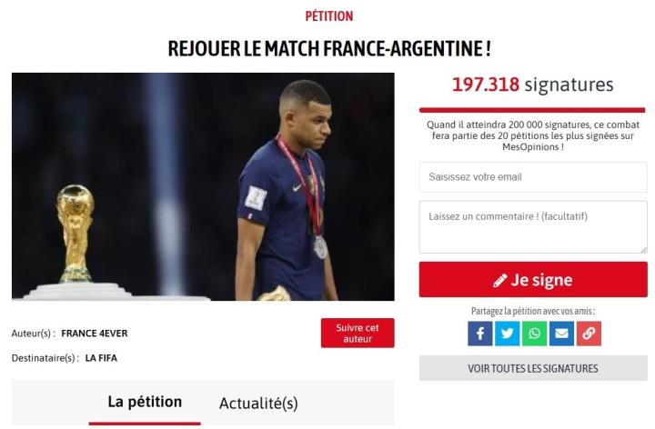 【近20万名法国球迷在网上向FIFA请愿,希望世界杯决赛重新踢】