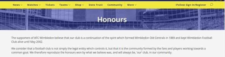 AFC温布尔登的支持者相信本会是延续1889年建立的温布尔登旧中央(Wimbledon Old Centrals)的精神及支持温布尔登足球俱乐部的存在直到2002年5月。我们深信一间俱乐部不单是控制球队的法律实体,亦是球迷与球员为建立相同目标而成立的社区。因此我们重现相信是在我们的社区,由永远是“我们的”俱乐部所获取的荣誉。