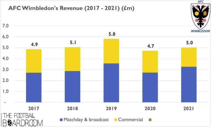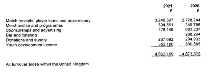 在2021年,AFC温布尔登的整体收入在500万镑左右,根据财报披露,结构如下: