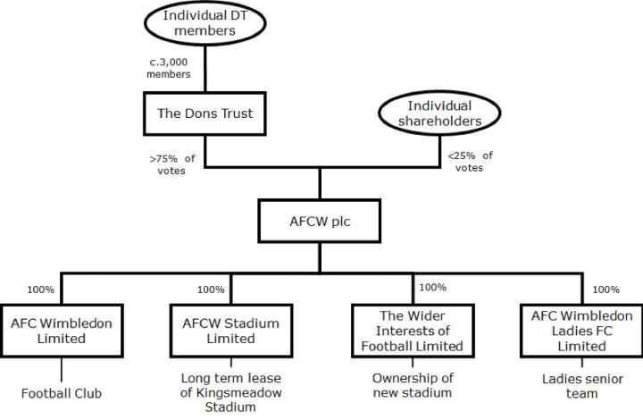 “AFCW PLC”的股份资本包括500万股面值1便士普通股及500万股面值1便士的普通A股,500万股普通股已全数配售,并由The Dons Trust持有,每股有3票投票权;而有240万股普通A股于2003年配售予球迷与投资人,每股只有1票投票权,融资约140万英镑收购京士美度球场(Kingsmeadow)的租约。目前,75%以上的股份和投票权由The Dons Trust掌握,剩余的由个人股份持有者所控制,包括花了250万镑购买了俱乐部10%股份的温布尔登居民、ASOS.com的联合创始人之一尼克·罗伯特森和风投公司Seedrs。The Dons Trust是一个由球迷团体构成的运营AFC Wimbledon的非盈利机构。