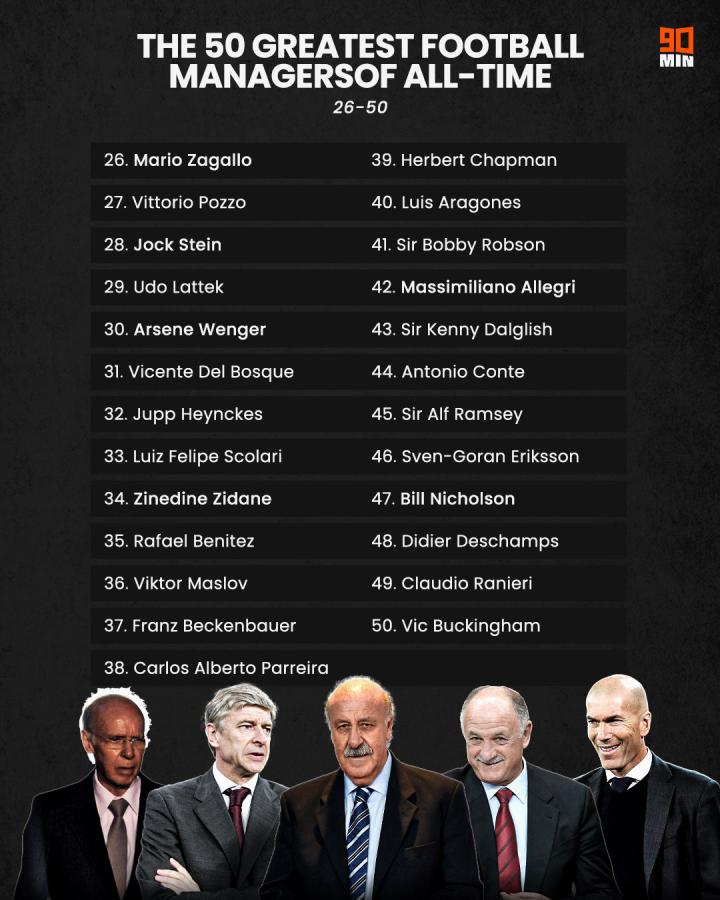 【史上50大足球主帅】 90min媒体平台继运动员后又评选出有史以来最伟大的50大足球主帅,前十名如下 1.弗格森(英国) 【执教过曼联、苏格兰国家队】 2.阿里戈·萨基(意大利) 【执教过AC米兰、马竞、意大利国家队】 3.里努斯·米歇尔斯(荷兰) 【执教过阿贾克斯、巴萨、勒沃库森、荷兰国家队】 4.佩普·瓜迪奥拉(西班牙) 【执教过巴萨、拜仁、曼城】 5.乔瓦尼·特拉帕托尼(意大利) 【执教过AC米兰、尤文、国米、拜仁、本菲卡、萨尔茨堡红牛、意大利国家队、爱尔兰国家队】 6.约翰·克鲁伊夫(荷兰) 【执教过阿贾克斯、巴萨】 7.恩斯特·哈佩尔(奥地利) 【执教过费耶诺德、塞维利亚、布鲁日、荷兰国家队、奥地利国家队】 8.埃莱尼奥·埃雷拉(阿根廷) 【执教过马竞、塞维利亚、巴萨、国米、罗马、西班牙国家队、意大利国家队】 9.若泽·穆里尼奥(葡萄牙) 【执教过本菲卡、波尔图、切尔西、国米、皇马、曼联、热刺、罗马】 10.鲍勃·佩斯利(英格兰) 【执教过利物浦】 除此之外,大家比较熟悉的主帅里,安切洛蒂第11,里皮第12,卡佩罗第16,克洛普第21,范加尔第22,博斯克第31,斯科拉里第33,齐达内第34,贝肯鲍尔第37,阿拉贡内斯第40,孔蒂第44,德尚第48。大家觉得哪位的排名令你意想不到呢?