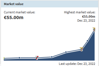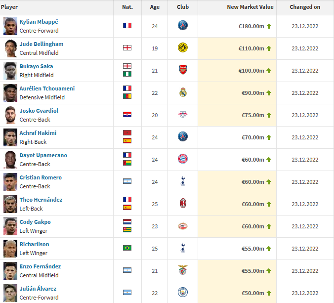 恩佐-费尔南德斯(Enzo Fernández)去年夏天从河床队以1200万欧元的价格加盟本菲卡队。仅仅几个月后,他就随阿根廷队赢得了世界杯冠军,并轻松成为世界上最受欢迎的球员之一。在为本菲卡出战22场比赛打进8球后,恩佐-费尔南德斯很快在世界杯之前将自己的市值翻了一番。现在,作为世界杯市值更新的一部分,恩佐-费尔南德斯是53名获得升值的球员之一。从3500万欧元跃升至5500万欧元,恩佐-费尔南德斯与姆巴佩(Kylian Mbappé),是世界杯身价更新的最大赢家,也是2022年市值增长最大的球员。