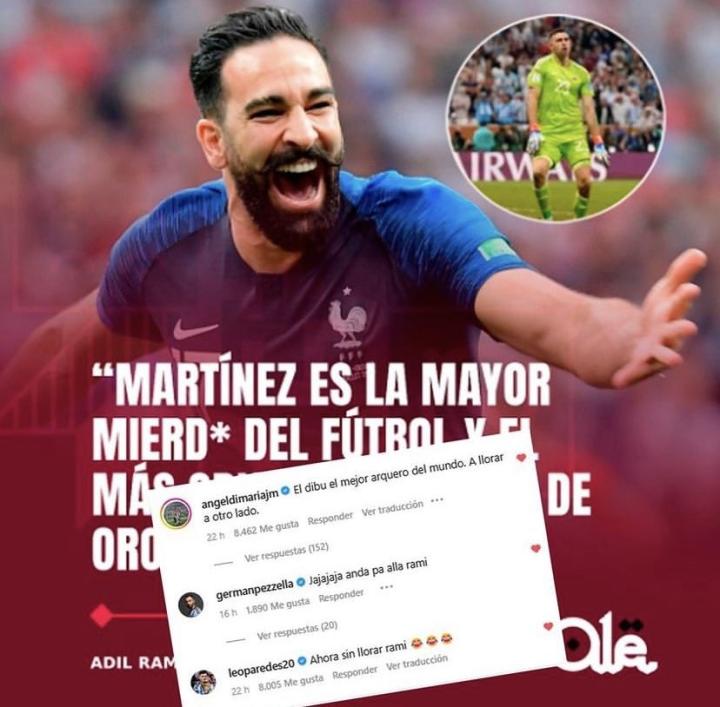 早些时候,前法国国脚拉米就阿根廷门将达米安-马丁内斯针对姆巴佩的庆祝动作在社交媒体上发文进行了抨击,不过这并没有影响到马丁内斯,根据《奥莱报》的报道,阿根廷队员迪马利亚、帕雷德斯和佩塞利亚还对拉米进行了回击。