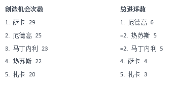 一支球队5名球员创造绝佳机会次数达到了20次以上,本赛季除了阿森纳没有任何一支球队可以做到。这就保证了阿森纳进攻的连贯性,即使某一名球员某场比赛表现不佳,其他球员也可以挺身而出拯救球队。