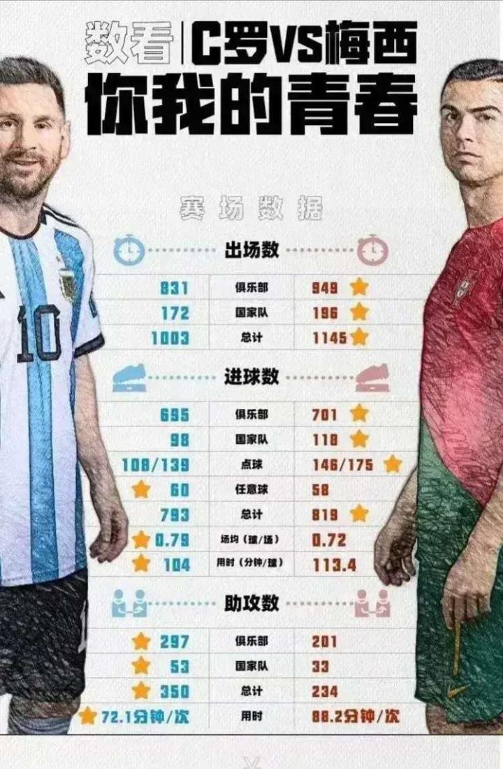 梅西C罗数据对比: C罗:进球数819,助攻23...