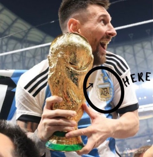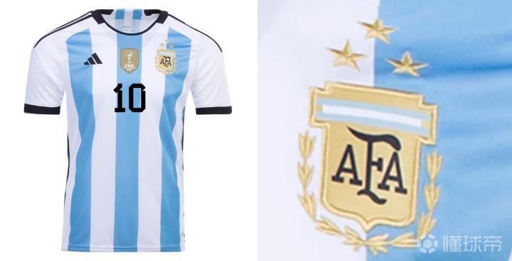 和2022版球衣相比,除了在两颗星的中线正上方位置处绣上了第三颗星之外,这款球衣还在正中央绣上了一个金色的FIFA世界杯徽章图案。