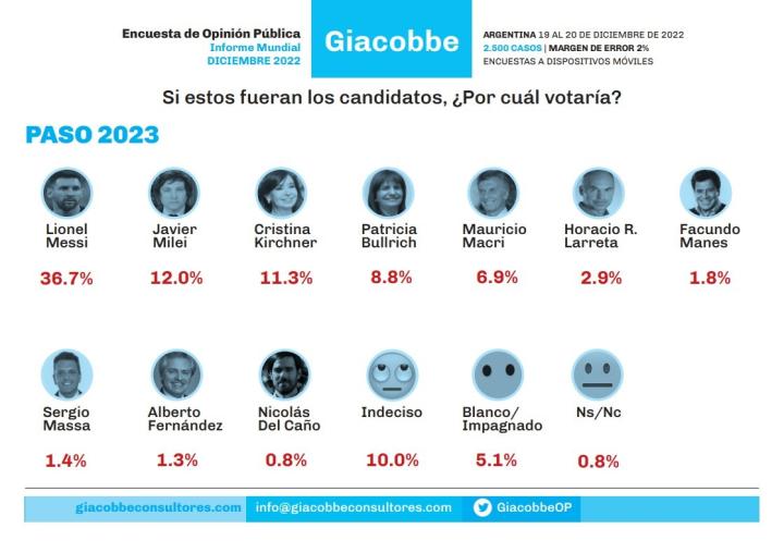 另一个与阿根廷队长可能的政治生涯有关的问题也被抛给了选民,包括梅西在内的10名候选人被介绍给了他们,然后他们被问到愿意将票投给谁。梅西以37%的比例名列前茅,领先于极右翼议员哈维尔-米莱伊(12%)和前总统兼现任副总统克里斯蒂娜-基什内尔(11%)。