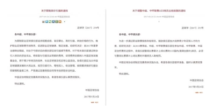 JekyllHyde2017年5月24日,中国足协在官方网站上发布了《关于限制高价引援的通知》和《关于调整中超、中甲联赛U23球员出场政策的通知》两则通知: