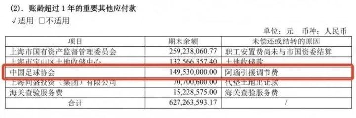 上港方面表示,己方有意缴纳,但因为足协开不出票据,该笔高达1.5亿元的支出只能被集团列入“账龄超过1年的重要其他应付款”予以暂时搁置。