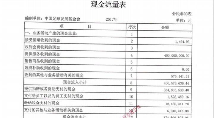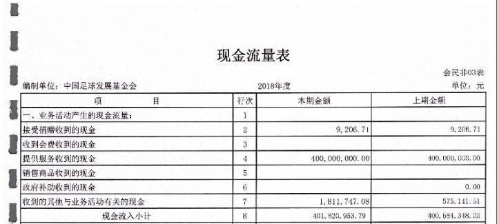 中国足球发展基金会审计报告也佐证了这一规定:2017和2018年,中国足球发展基金会都没有任何的捐赠收入,均只有提供服务收到的现金4亿元,来源不明(根据2020年的审计报告,应是体育总局拨款):