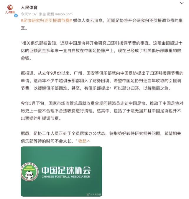 从去年9月份以来,广州、国安等俱乐部就向中国足协提出了归还引援调节费的申请,希望中国足协归还当年收取的引援调节费,以缓解俱乐部困难。