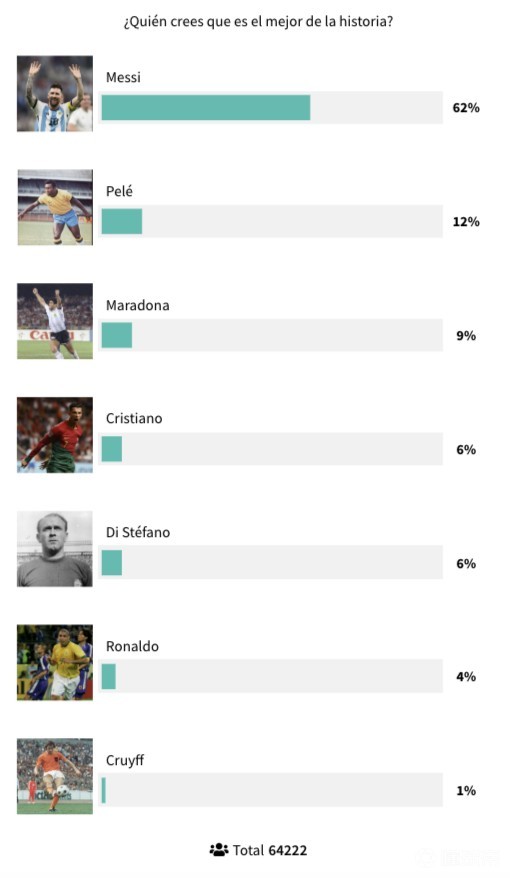 由读者投票选出谁是历史最佳球员,最终有64222名读者参与了投票,梅西得票率为62%,排名第一,贝利以12%的得票率排名第二,马拉多纳排名第三,得票率为9%,C罗获得了6%的投票,排名第四,迪斯蒂法诺排名第五,得票率为6%,罗纳尔多4%,克鲁伊夫1%。
