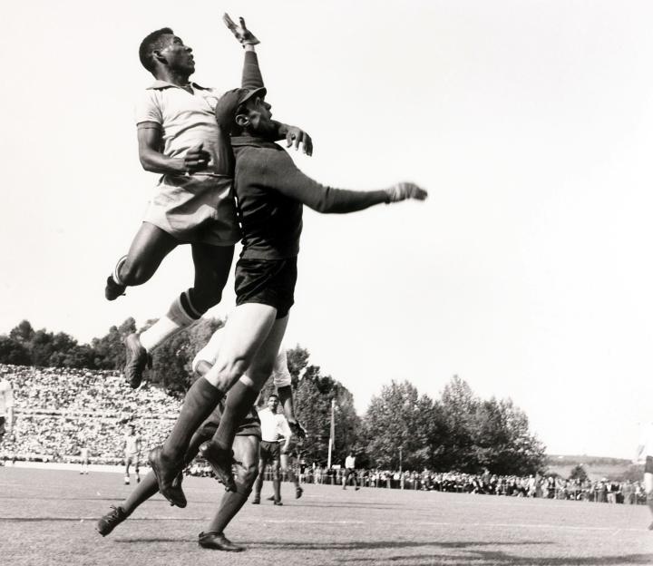 1958世界杯,17岁的贝利面对瑞典时的一次头球抢点
