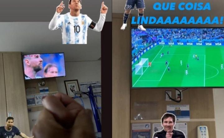 此前由贝利女儿分享的,贝利在住院期间收看世界杯的照片