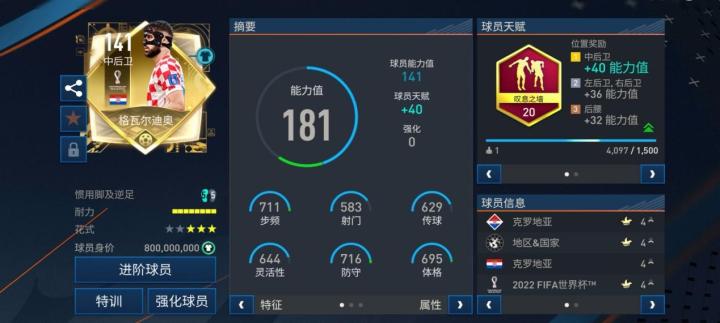游戏中,最佳球员版本格瓦迪奥尔司职中后卫,配备了至尊天赋叹息之墙,对他的加速、人盯人、铲断、拦截、侵略性五项数据提升显著。