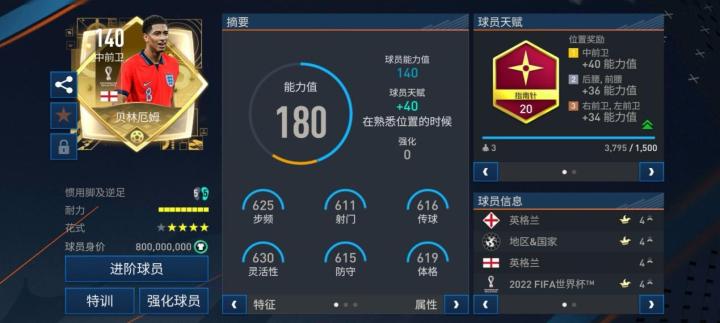 游戏中,贝林厄姆推出的这张世界杯最佳球员版本同样备受瞩目,司职中前卫的他配备了全新天赋指南针,对他的加速、射门力量、盘带、控球、敏捷五项数据提升显著。