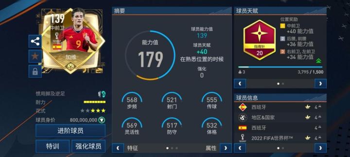 游戏中,加维在世界杯新秀球员版本后又推出了这张世界杯最佳球员版本,司职中前卫的他配备了至尊天赋指南针,对他的加速、射门力量、盘带、控球、敏捷五项数据有所提升。