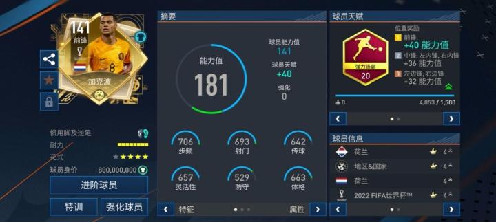 游戏中,加克波推出的这张世界杯最佳球员版本给到了前锋位置,能力值也达到现役最强的141。