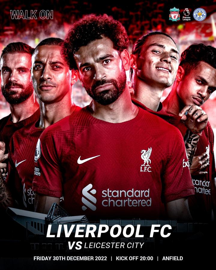 2022年最后一战!利物浦官方发布比赛海报:萨拉赫C位ETChalmers @懂球帝2022-12-30 17:07英超第18轮,利物浦将对阵莱斯特城,赛前利物浦官方发布比赛海报,萨拉赫C位出镜。北京时间12月31日凌晨4:00,利物浦将在主场对阵莱斯特城,这是利物浦2022年最后一场比赛。赛前,利物浦官方发布比赛海报,萨拉赫C位出镜,亨德森、蒂亚戈、努涅斯和法比奥-卡瓦略也出镜。展开更多