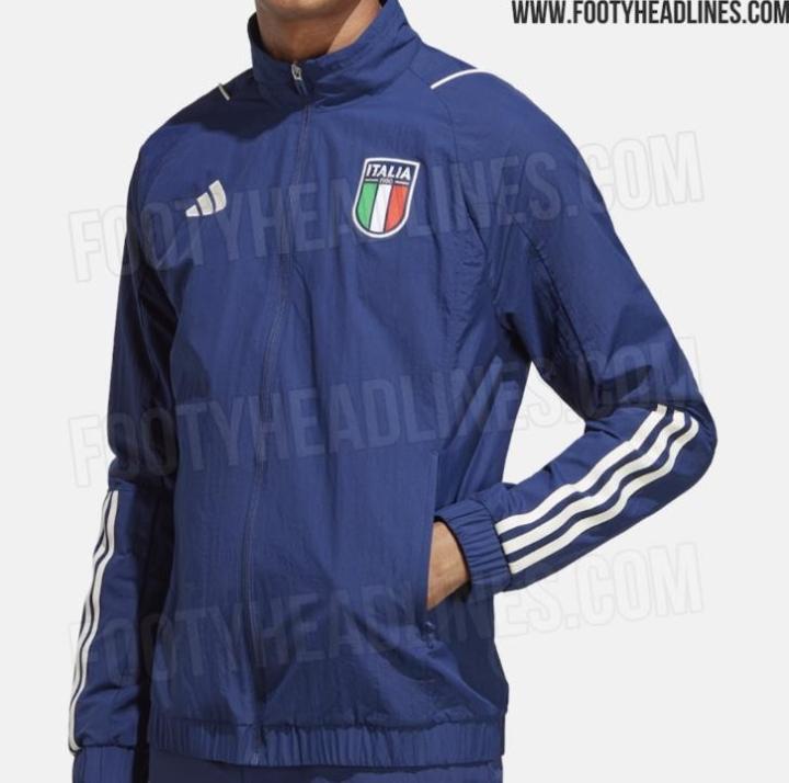 阿迪达斯设计的意大利2023年发布会夹克采用了海军蓝和白色的现代设计。它没有任何图形设计或其他花哨的元素。