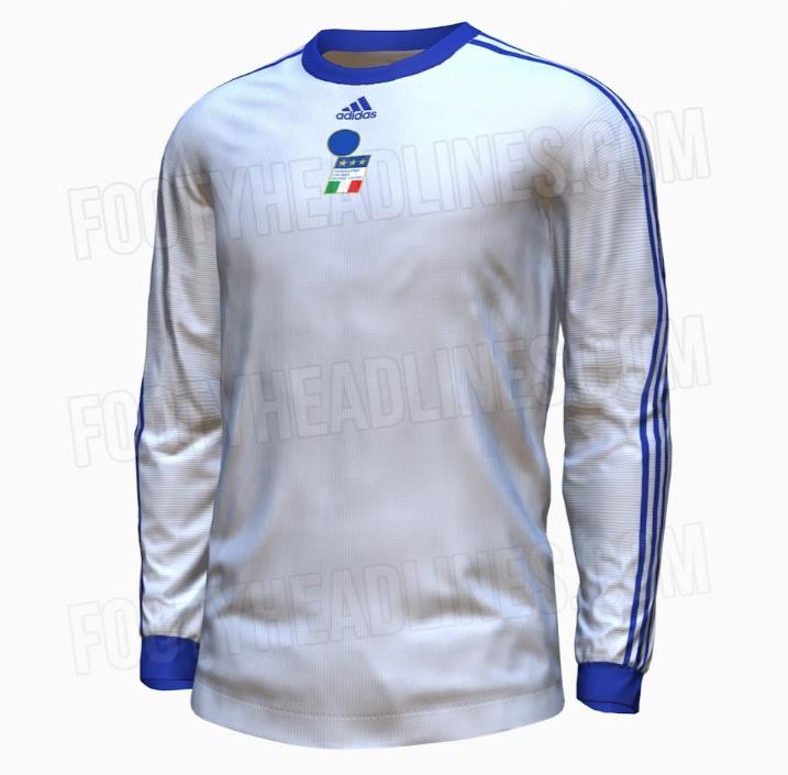 阿迪达斯设计的意大利队2023年门将重制球衣的灵感来自迪诺-佐夫在1974年世界杯上穿的(无品牌)球衣。它是浅灰色的,带有蓝色的标志和意大利国旗。