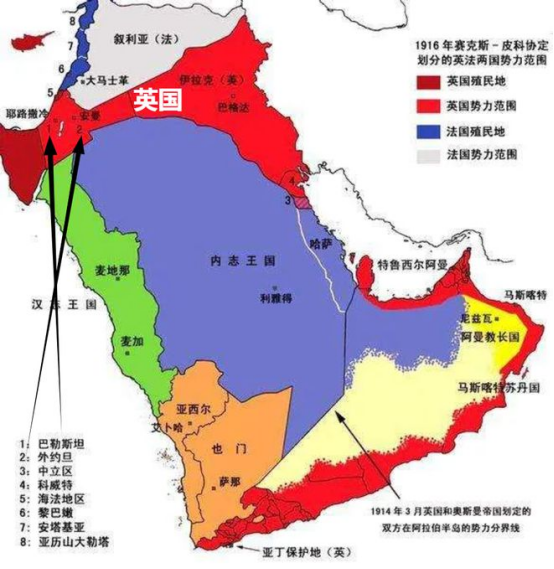 汉志王国希望统一阿拉伯地区,重塑阿拉伯帝国的荣光。英法始终不愿意哈希姆家族统一阿拉伯。又玩了分权制衡的招数——哈希姆家族后人担任三个国家的国王——汉志、约旦和伊拉克。