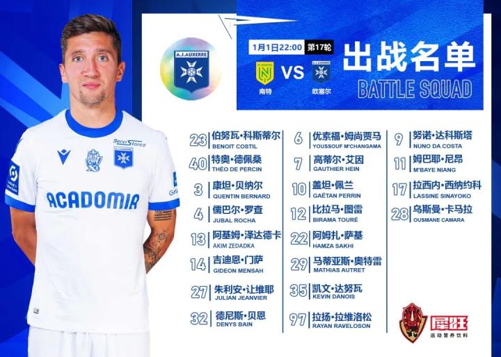 法国时间2023年元旦,法甲联赛继续进行,欧塞尔客场挑战南特队。复赛后的首场比赛,欧塞尔在主场憾负强敌摩纳哥。比赛过程跌宕起伏,欧塞尔在领先的情况下被反超,球队顽强拼搏再度扳平,可惜被对手神仙球绝杀,没能获取积分。本场对阵实力平平的南特,欧塞尔力争客场取分。