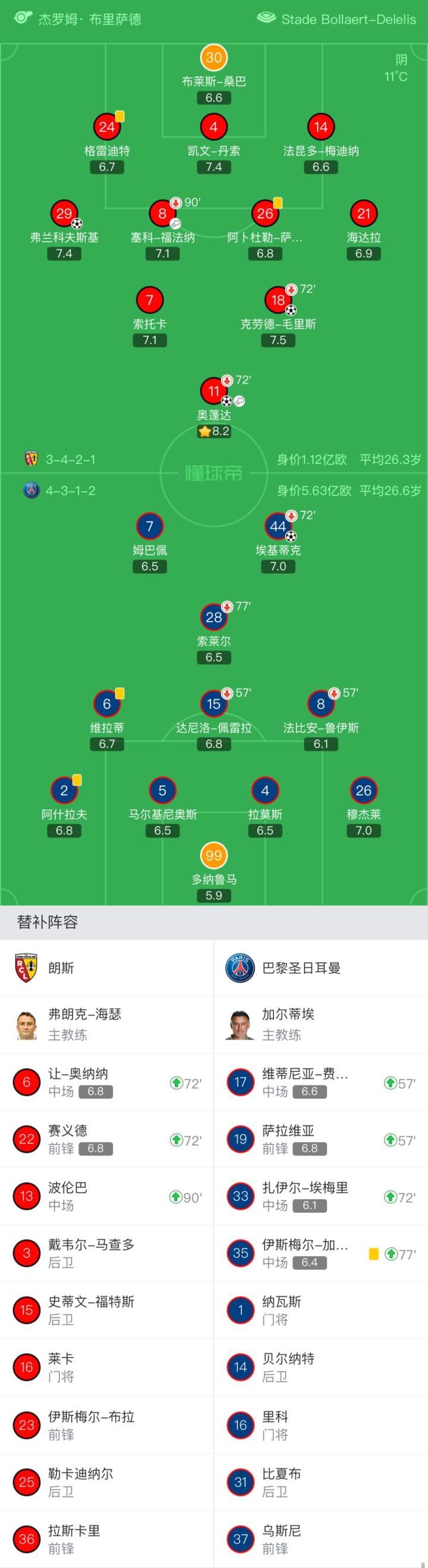 朗斯首发:30-桑巴、24-格雷迪特、4-丹索、14-梅迪纳、29-弗兰科夫斯基、26-萨梅德、21-海达拉、8-福法纳(94'13-波伦巴)、18-毛里斯(72'6-奥纳纳)、7-索托卡、11-奥蓬达(72'22-赛义德)