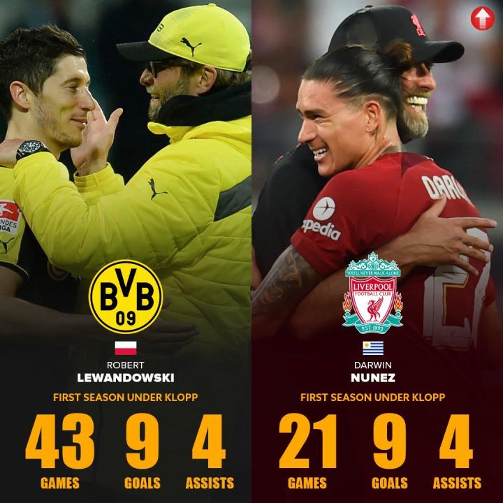 (图)如今的“边锋”努涅斯与当年的“前腰”莱万多夫斯基有所不同,但两名球员都有着惊人的上升空间。