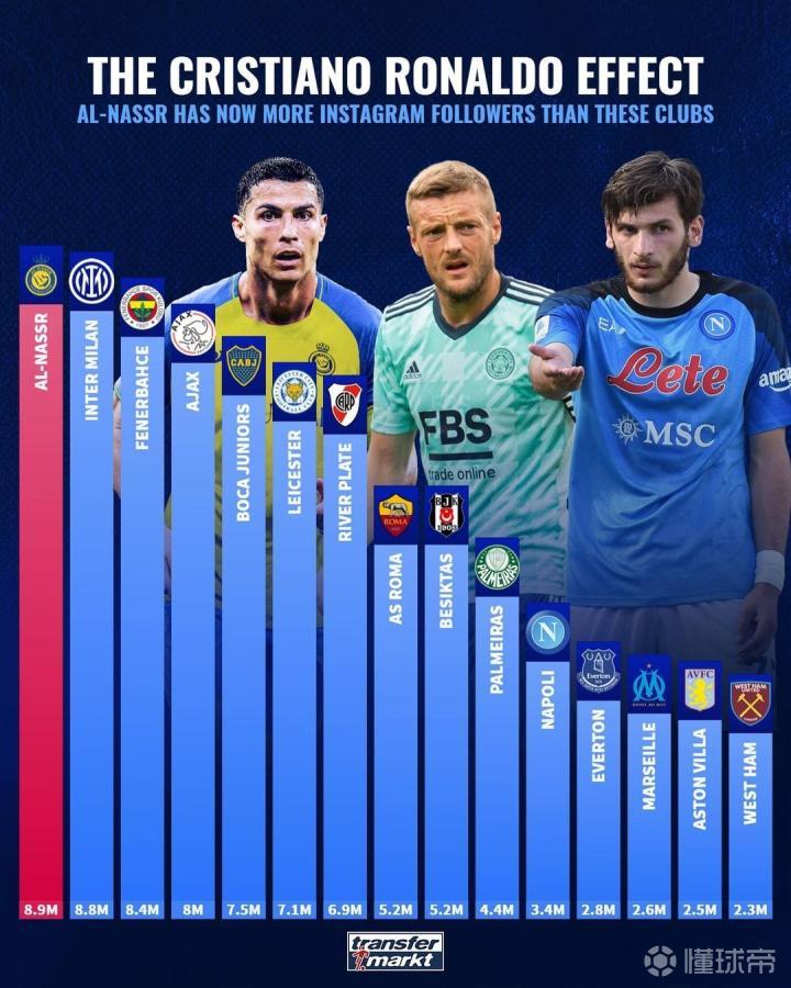 C罗效应,利雅得胜利官媒粉丝数已达890万,超过国米等俱乐部