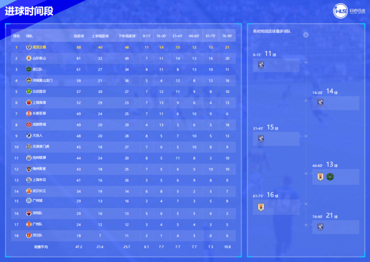 本赛季中各球队平均每支球队打入47.2粒进球,上半场平均打入21.4粒进球,下半场平均打入25.7粒进球,从进球时间段的分布来看,产生进球最多的时间段是在比赛第76~90分钟。获得冠军的武汉三镇在上半场三个时间段以及下半场76~90分钟时间段都取得了最高的进球数,获得亚军的山东泰山队则是在比赛下半场第46分钟到75分钟时间段保持了最高的进球数。