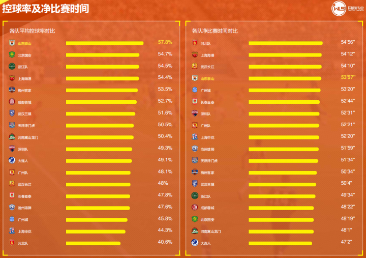 本赛季各支球队的控球率上,山东泰山以平均控球率57.8%排名第一,随后的几支球队控球率相差不大分别是北京国安54.7%、浙江队54.5%、上海海港54.4%、梅州客家53.5%。在净比赛时间上值得大家注意的是,本赛季惨遭降级的河北队和武汉长江在净比赛时间上竟然分别以54'56"和54'10"位居排行榜第一、第三位,可以看出两支球队在比赛的节奏感和流畅性的控制上还是很出色的,球员也为高质量的比赛付出了积极努力。
