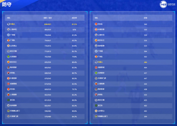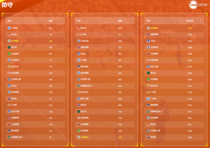 从防守数据来看,大连人的抢断次数最高,其次是上海申花、广州城、广州队,无论几支球队的最终成绩如何,但是队员拼抢的意识和积极性还是值得称赞的;河北队在封堵和解围数据上排行第一,拦截榜排名第二,从侧面可以看出河北队在本赛季整体处于较为被动的状态;在夺回球权的数据中看到山东泰山、成都蓉城、大连人、上海申花、上海海港依次位列前五位,说明这几支球队具有出色的反抢能力。