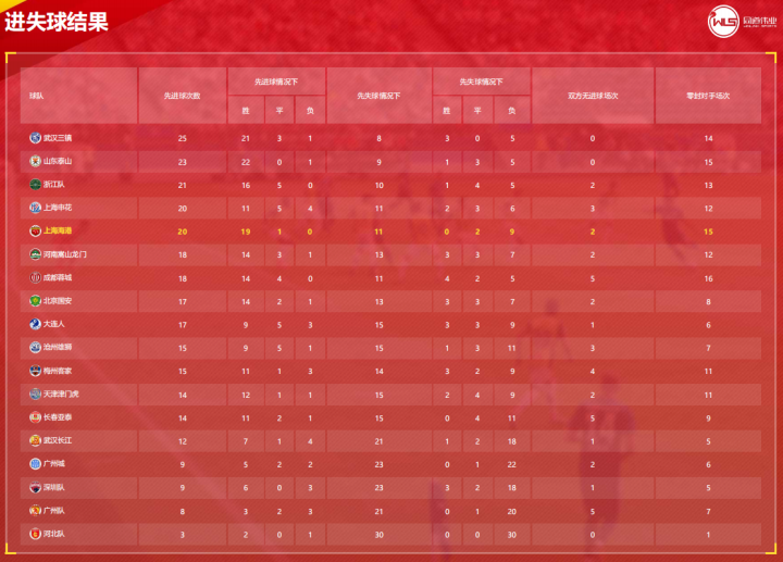 从先进球次数来看,排名和联赛积分排名差异不大,先取得进球的球队在比赛中更容易掌握比赛的主动权。在这组数据中比较有特点的是上海海港,上海海港在先取得进球的20场比赛当中取得了19胜1平的好成绩,但是在先失球的11场比赛中竟然没有一场比赛取得胜利,看得出上海海港不太擅长打逆风球。