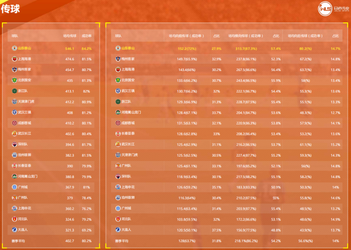 传球数据中,赛季的球队平均场均传球402.7次,成功率为80.2%,其中山东泰山、上海海港、梅州客家、北京国安、浙江队依次位列前五位,看得出这几支球队的球员之间的配合更加紧密,从几支球队的最终成绩排名来看,出色的传导配合也取得了不错的效果。