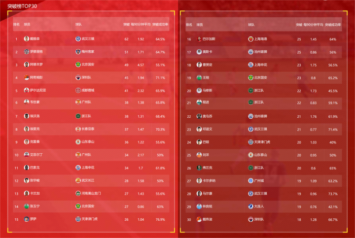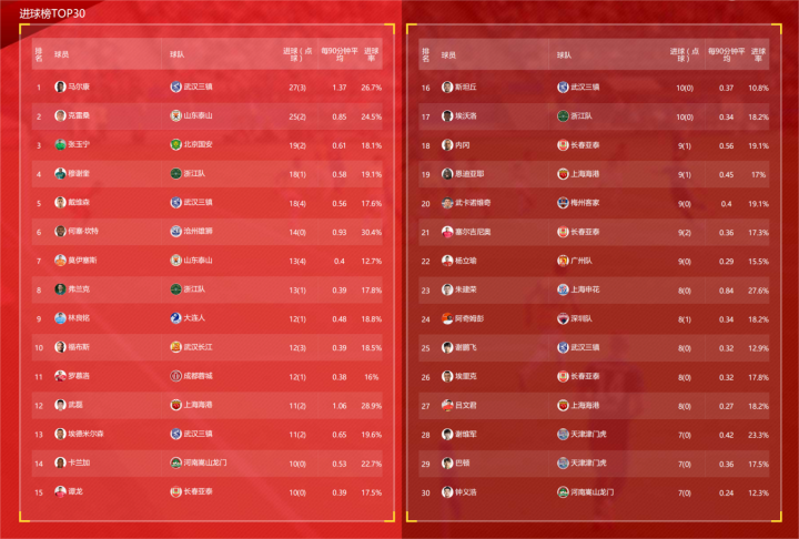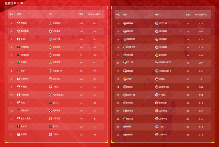 榜中前五名全部为外援球员,分别是武汉三镇的戴维森、梅州客家的罗德里格、北京国安的阿德本罗、深圳队的阿奇姆彭、成都蓉城的萨尔达尼亚。TOP30中有包括韦世豪在内的10名本土球员上榜。