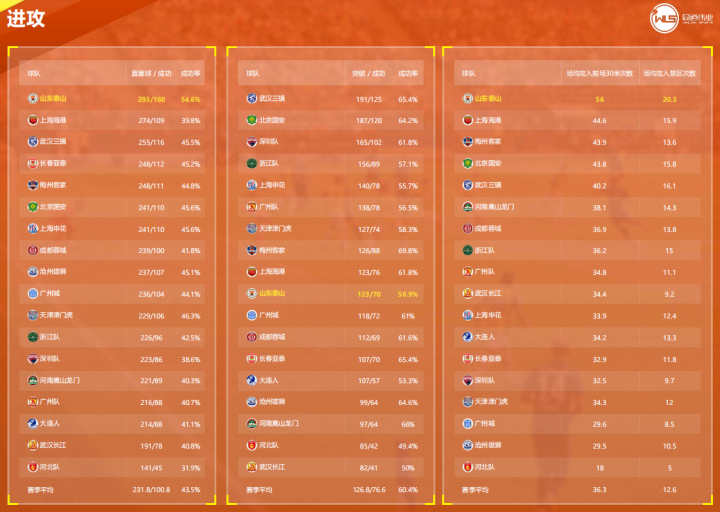 在进攻方式上,山东泰山、上海海港、武汉三镇、长春亚泰、梅州客家位列直塞球进攻榜前五位,其中上海海港的直塞球成功率较其他几支球队略低;武汉三镇、北京国安、深圳队、浙江队、上海申花依次位列突破榜的前五位,其中深圳队虽然本赛季积分排名靠后,但是球队的突破能力却不容小觑。从场均攻入前场30米以及禁区的次数来看,山东泰山、上海海港、梅州客家、北京国安、武汉三镇排名靠前,山东泰山相比武汉三镇给对手造成的前场威胁更大。