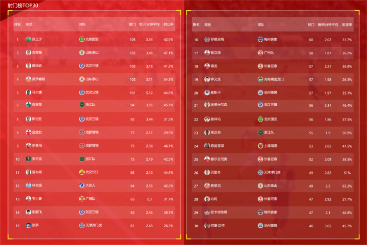 射门榜中,作为本土球员的北京国安张玉宁以赛季105次射门高居榜首,超过了克雷桑、戴维森、莫伊塞斯、马尔康等一众外援球员。此外在射门榜TOP30当中还有包括其他6名本土球员,共7人上榜。