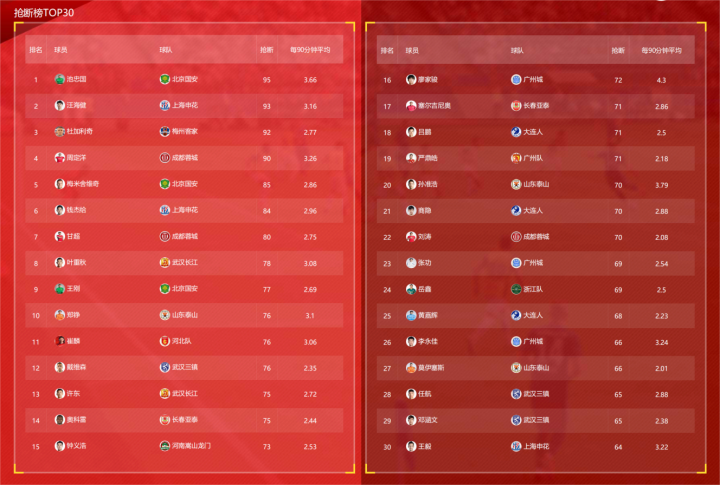抢断榜中北京国安的池忠国以赛季95次抢断位居榜首,其次位于前五位的分别是上海申花的汪海健、梅州客家的杜加利奇、成都蓉城的周定洋、北京国安的梅米舍维奇。TOP30榜单中共有本土球员23人上榜。