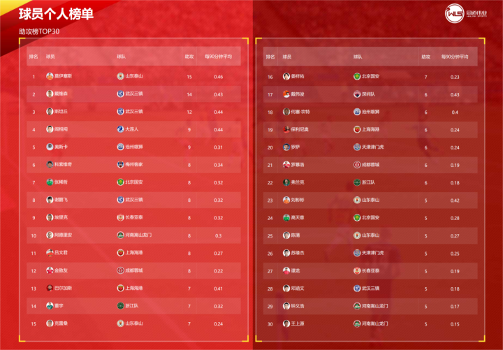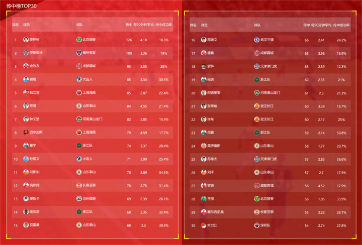 在传中数据榜中,山东泰山、上海海港、大连人、河南嵩山龙门、梅州客家几支球队位列前五名,看得出这几支球队更加注重边路区域的进攻。