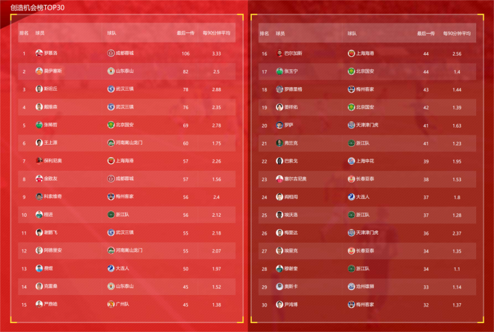 创造机会榜的前五名为成都蓉城的罗慕洛、山东泰山的莫伊塞斯、武汉三镇的斯坦丘、武汉三镇的戴维森、北京国安的张稀哲。其中排名第一的罗慕洛以106次最后一传的数据超过第二名莫伊塞斯24次,可谓是“机会创造之王”,TOP榜单中共有本土球员9人上榜。