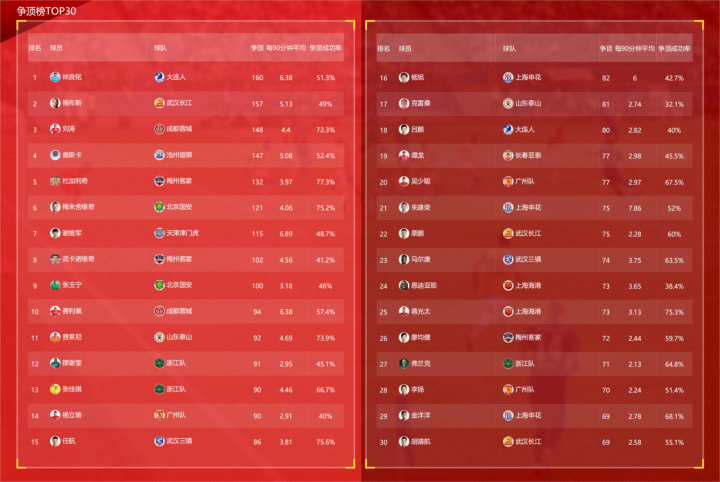 争顶榜中大连人的林良铭以赛季160次争顶次数位居榜首,其次位居前五位的分别是武汉长江的福布斯、成都蓉城的刘涛、沧州雄狮的奥斯卡、梅州客家的杜加利奇。TOP30中本土球员共有18人。