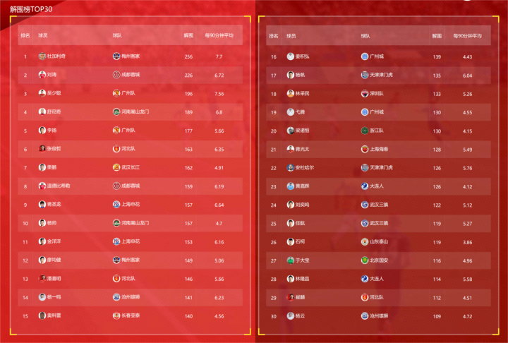 解围榜中梅州客家的杜加利奇以赛季256次解围位居榜首,其次位居前五位的分别是成都蓉城的刘涛、广州队的吴少聪、河南嵩山龙门的舒尼奇、广州队的李杨。TOP30榜单中本土球员共有25人。