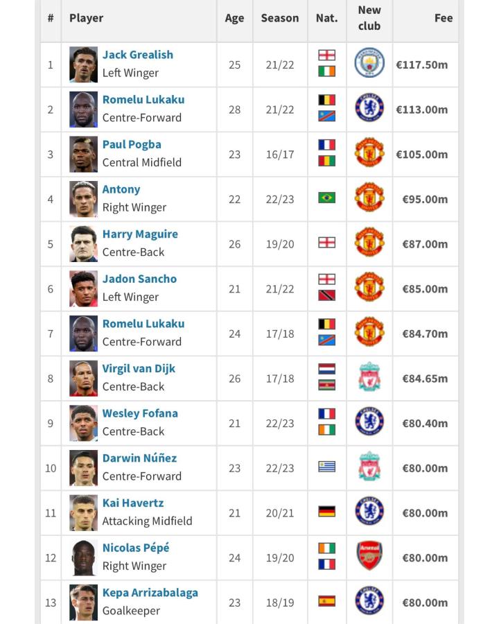 一名Twitter用户发布的截图显示英超历史上最昂贵的13名球员,该截图在发布后风靡一时。